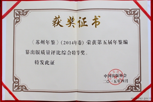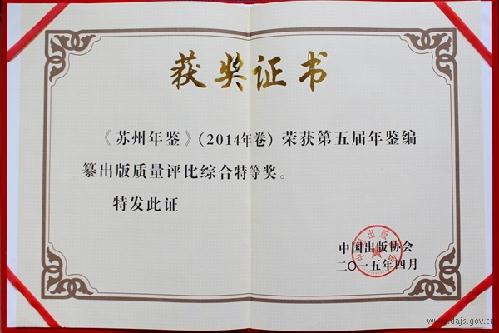 2015年4月21~23日,第十六次全國地州區縣年鑒研討會暨第五屆年鑒編纂出版質量評比頒獎大會在杭州市蕭山區舉行,來自全國各地300多名年鑒工作者參加此會。蘇州市年鑒編纂委員會辦公室編纂的《蘇州年鑒(2014)》在會上榮獲城市綜合特等獎及框架設計、條目編寫、裝幀設計三個單項特等獎。中國版協年鑒工委主任許家康為蘇州市檔案局局長、《蘇州年鑒》主編肖芃頒發城市年鑒綜合特等獎獎狀。