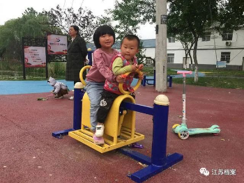 一對小姐弟在健身器材上玩耍。(高峰攝)
