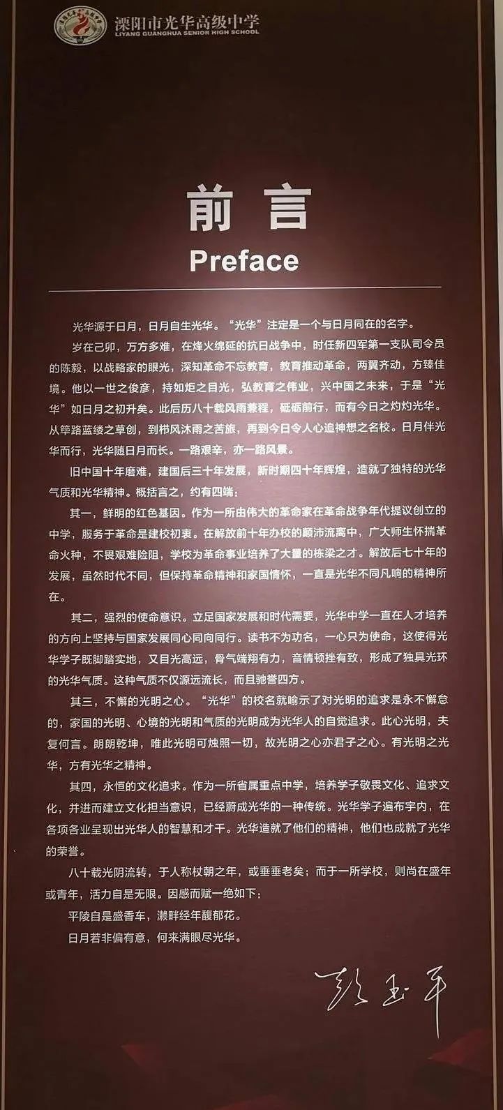 記者走進如今的溧陽光華高級中學看到,校名“光華中學”由葉飛上將題寫,進入校門是一座肅穆的陳毅元帥塑像,塑像的基座上是國防部原部長張愛萍題寫的“功業千秋,遺愛萬代”八個遒勁大字,這些令人肅然起敬的標志,無不顯露出這所傳奇學校的光榮歷史:“光華中學”的創辦,可以追溯到八十多年前,在當時是一座聞名一方的“紅色學校”!