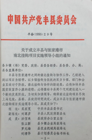 豐委[1995]29號文件:《關于成立豐縣與張家港市南北掛鉤項目實施領導小組的通知》