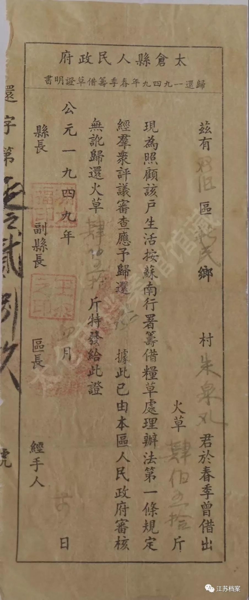 大家好,我是太倉市檔案館的紅色珍檔守護人嵇秋紅。今天我要介紹的紅色檔案,是“太倉縣人民政府歸還1949年春季籌借草證明書”。