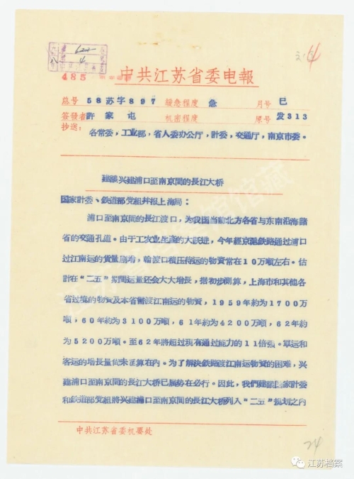 △1958年6月20日,中共江蘇省委《建議興建浦口至南京間的長江大橋》的電報