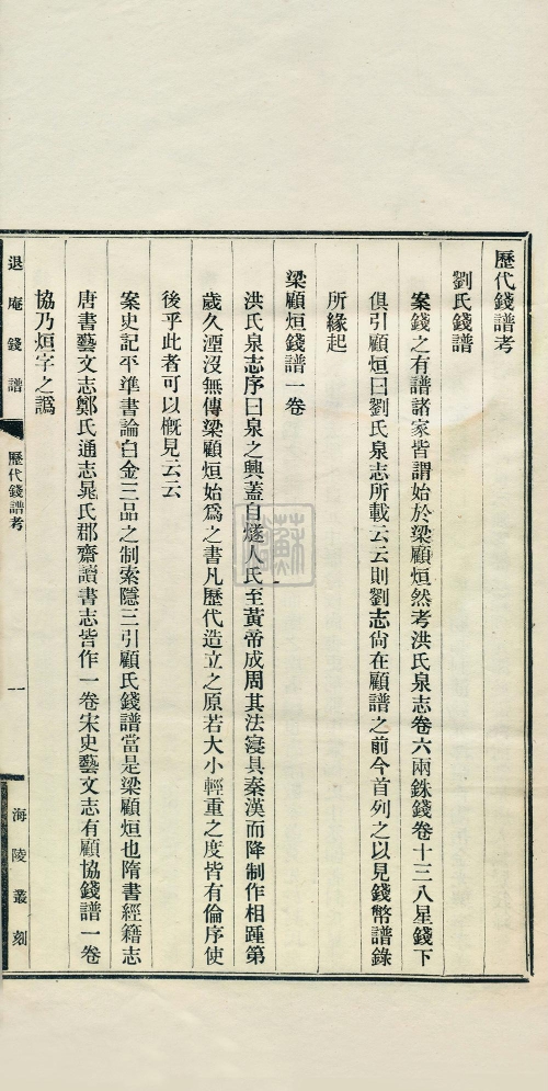 《海陵叢刻》第三種——《歷代錢譜考》,清代夏(號退庵)編輯
