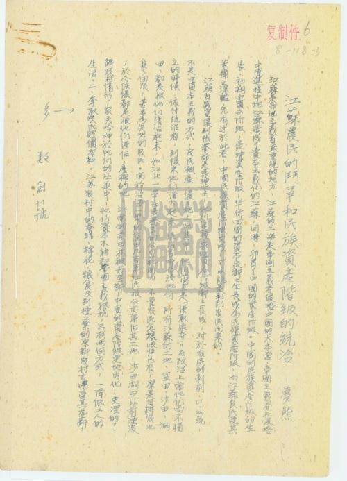 館藏土地革命戰(zhàn)爭時(shí)期中共江蘇省委檔案共2806件,主要有各種會(huì)議文件及記錄,宣傳教育文件材料,組織工作材料,職工運(yùn)動(dòng)、農(nóng)民運(yùn)動(dòng)文件,反帝反軍閥斗爭文件等,涉及眾多中共黨史上的重要人物和重大事件,比較全面地反映了土地革命戰(zhàn)爭時(shí)期中共江蘇省委光榮、曲折、艱難的奮斗歷程,是研究中國共產(chǎn)黨在江蘇早期革命斗爭歷史不可或缺的第一手資料,也是進(jìn)行黨史教育的重要資料。