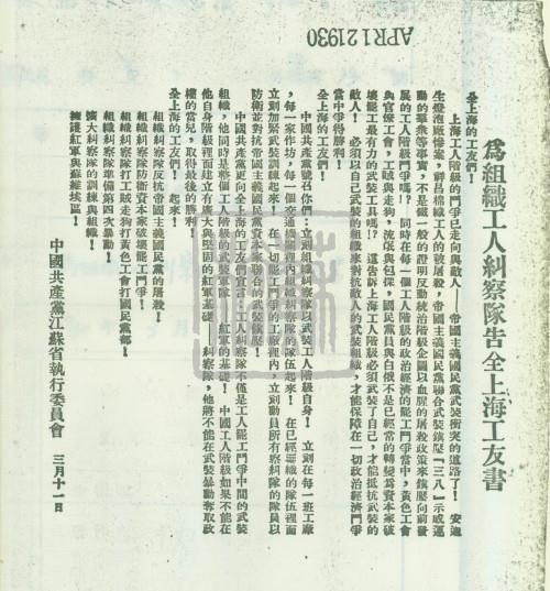 中國共產(chǎn)黨江蘇省執(zhí)行委員會(huì)《為組織工人糾察隊(duì)告全上海工友書》