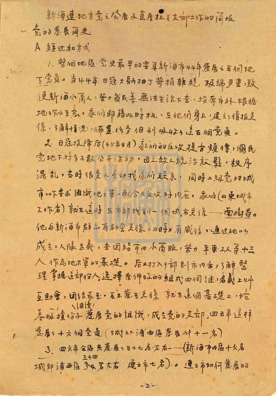 《新海市地方黨的發展史和支部情況簡報》摘選1