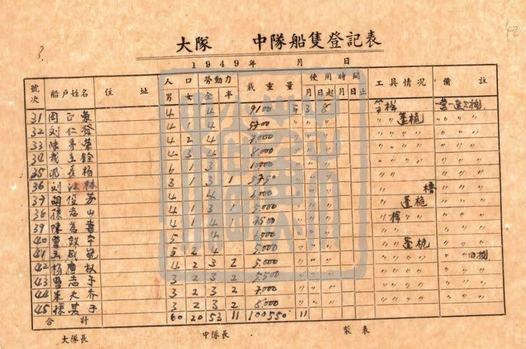 內容與評價:1949年2月13日,中共華中工委成立渡江準備委員會,統一一切渡江工作的領導,包括情況偵查、糧食南運、船只準備、民工調度等等。下設渡江船只管理局,對籌集來的船只進行檢查、分類、維修、訓練、調度。華東野戰軍司令員陳毅曾深情地說:“淮海戰役的勝利,是人民群眾用小車推出來的。”其實何止小車?人民群眾貢獻了后勤所需要的,包括牛馬車船在內的一切。登記表中記錄了船戶姓名,家庭勞動力情況以及船只情況。70 多年間物是人非,但當年那一個個勤勞勇敢的名字卻長留在檔案中,成為我們寶貴的精神財富。